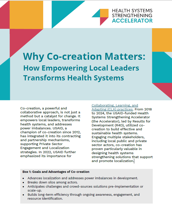This brief describes how the USAID-funded Health Systems Strengthening Accelerator utilized co-creation to build effective and sustainable health systems.